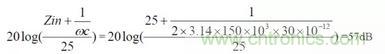 傳導(dǎo)發(fā)射測(cè)試設(shè)備內(nèi)部的去耦網(wǎng)絡(luò)(LISN)內(nèi)阻Zin 標(biāo)準(zhǔn)為50Ω。則耦合電容C7 與測(cè)試設(shè)備去耦網(wǎng)絡(luò)的內(nèi)阻Zin 對(duì)騷擾電平的衰減為: