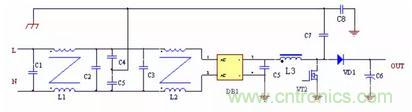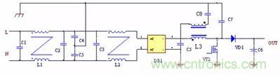 在0.15MHz~1MHz 的頻率范圍內(nèi),騷擾主要以共模的形式存在,在1MHz~10MHz 的頻率范圍內(nèi),騷擾的形式是差模和共模共存,在10MHz 以上,騷擾的形式主要以共膜為主。傳導(dǎo)發(fā)射的差模騷擾的產(chǎn)生主要是由于開(kāi)關(guān)管工作在開(kāi)關(guān)狀態(tài),當(dāng)開(kāi)關(guān)管開(kāi)通時(shí),流過(guò)電源線的電流線形上升,開(kāi)關(guān)管關(guān)斷時(shí)電流突變?yōu)?,因此流過(guò)電源線的電流為高頻的三角脈動(dòng)電流,含有豐富的高頻諧波分量,隨著頻率的升高,該諧波分量的幅度越來(lái)越小,因此差模騷擾隨頻率的升高而降低,另外,如下圖1 所示,由于電容C5 的存在,它與電感L3 組成低通濾波器,因此,差模傳導(dǎo)騷擾主要存在低頻率段。