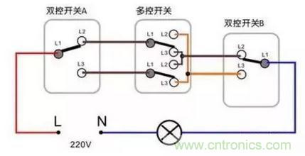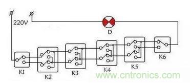 這樣的線路在電梯中常用,當然有時臥室改的細致一點,床左右都加上開關,門口再一個,也是單聯(lián)三控線路了。