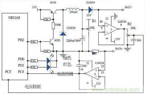 本系統(tǒng)主要有微控制器、電壓檢測電路、電流檢測電路、電池狀態(tài)指示電路和充電控制電路組成,電路原理圖如圖所示。