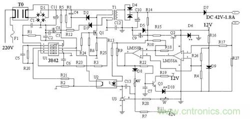 本電路設(shè)有反極性保護(hù)電路,由D4,U,U1D,T1及外圍元件構(gòu)成,當(dāng)電池反接時(shí),充電器限制輸出電流不致發(fā)生事故。充電指示由U,D7及外圍元件構(gòu)成,充電時(shí),D7點(diǎn)亮,充電器進(jìn)入浮充狀態(tài)后,D7熄滅,表示充電結(jié)束。