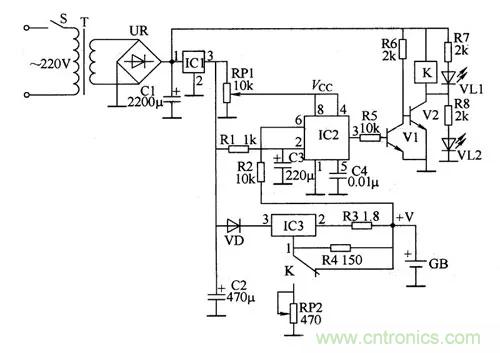 集成電路IC1組成;充電電路由二極管VD、三端可調(diào)穩(wěn)壓集成電路IC3、電阻R2~R4、電位器RP2和繼電器K的控制觸頭等組成;控制電路由時(shí)基集成電路IC2、電位器RP1、電阻R1、R5~R8、電容C3、C4、晶體管V1、V2、繼電器K和發(fā)光二極管VL1、VL2組成。