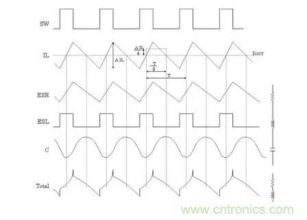 通過開關所產生的電感電流紋波ΔIL將產生與ESR成單純正比的紋波電壓,有些ESL則會產生方形波電壓,與電容值部分合成,最下方波形成為最終的輸出紋波電壓波形。