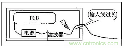 許多設備的電源線進入機箱后,經(jīng)過很長的導線才接到濾波器的輸入端。例如,電源線從機箱后面板輸入,走行到前面板的電源開關(guān),又回到后面板接到濾波器?;蛘邽V波器的安裝位置距離電源線入口較遠,造成引線太長(如圖1所示)。