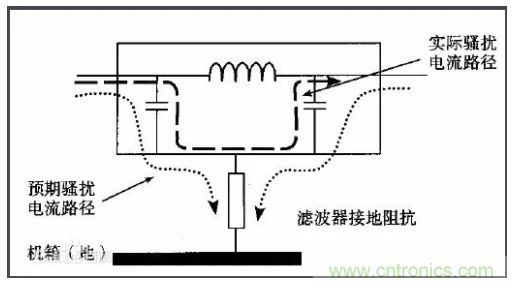 由于接地線較長,在高頻時導線的分布電感不能忽視,如果濾波器搭接良好,干擾信號可以通過殼體直接接地。如果濾波器的殼體和機箱之間搭接不良,相當于濾波器的殼體(地)與機箱之間存在一個分布電容,這將導致濾波器高頻時接地阻抗較大,尤其在分布電感和分布電容諧振的頻率附近,接地阻抗趨于無窮。