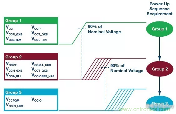 市場中較新的FPGA在規(guī)格中會(huì)提供針對(duì)啟動(dòng)和關(guān)斷電源時(shí)的序列順序提出特定的要求,確保FPGA正常開啟及復(fù)位,保持最小的電流消耗,并在電源轉(zhuǎn)換期間將I/O保持在正確的三態(tài)配置下。再以Arria 10為例,其技術(shù)規(guī)格將電源分為三個(gè)序列組(1、2、3),并要求它們按升序排列為1、2、3,然后按相反的順序降序排列:3、 2、1。