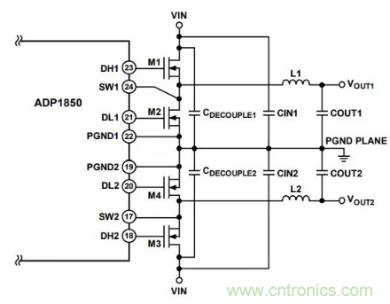 作為例子的開關(guān)調(diào)節(jié)器布局采用雙通道同步開關(guān)控制器 ADP1850,第一步是確定調(diào)節(jié)器的電流路徑。然后,進(jìn)行物理規(guī)劃和電源器件的考慮。此外,我們需要了解一點(diǎn):電流路徑?jīng)Q定了器件在該低噪聲布局布線設(shè)計(jì)中的位置。