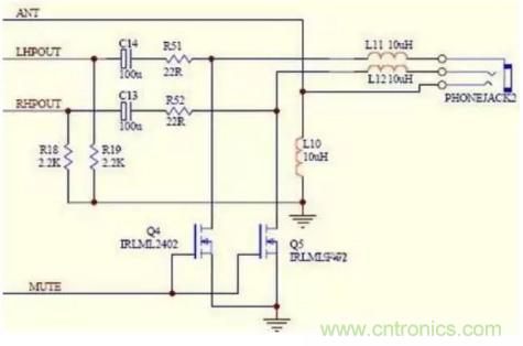 上圖是一個有主控控制耳機有沒有聲音輸出的電路圖,聲音的左右聲道分別通過隔直流電容C13、C14和電阻R51、R52送到耳機孔,但是在電阻R51、R52和耳機孔之間卻接入了一個N溝道的mos場效應管,這個場效應管的柵極連接在一起受著MUTE的控制,當MUTE的地方處于高電位時候,Q4、Q5導通,就會把聲音通過Q4、Q5入地,耳機里就不會有聲音了,當MUTE的地方處于低電位時候,Q4、Q5關(guān)斷,聲音就只有通過耳機而發(fā)出聲音了!