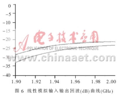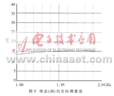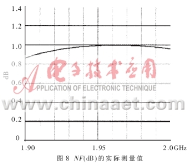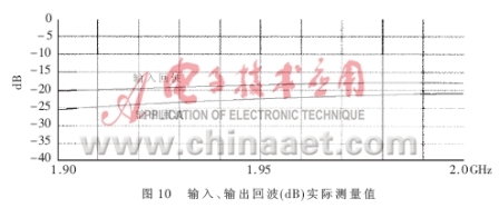 得到了完整的電路PCB板后,就要實(shí)際測量電路的各個(gè)參數(shù),驗(yàn)證設(shè)計(jì)的仿真結(jié)果是否與之相符,是否最終符合表1的設(shè)計(jì)技術(shù)規(guī)范。本文所采用的測試儀器是HP8753ES網(wǎng)絡(luò)分析儀和HP8970B噪聲儀。圖8、圖9表達(dá)出放大器實(shí)測的NF和增益曲線,在帶寬為0.1GHz的頻率范圍內(nèi)NF的值在0.8dB和1.0dB之間,增益在1.97GHz達(dá)到最大值15.5dB,在1.99GHz達(dá)到了15.3dB。由于NF是在實(shí)際PCB板外腔體內(nèi)測得的,包含了同軸連接器的損耗和二級噪聲損耗,其測量指標(biāo)表明實(shí)際的電路NF特性要稍差于模擬特性。圖10是輸入、輸出的回波曲線。當(dāng)頻點(diǎn)在1.96GHz時(shí),輸入回波為18dB,輸出回波達(dá)到22.5dB,放大器的OIP3在直流偏置Vds=3V,Id=60mA時(shí)測得值為37dBm,P1dB為21.4dBm。電路在較低的偏置狀態(tài)下Vds=3V,Id=40mA放大器的NF和增益都沒有降低,只有OIP3測出下降為36.5dBm。