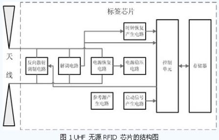 如圖1 所示,一個(gè)完整超高頻無(wú)源RFID 標(biāo)簽由天線(xiàn)和標(biāo)簽芯片兩部分組成,其中,標(biāo)簽芯片一般包括以下幾部分電路:電源恢復(fù)電路、電源穩(wěn)壓電路、反向散射調(diào)制電路、解調(diào)電路、時(shí)鐘提取/產(chǎn)生電路、啟動(dòng)信號(hào)產(chǎn)生電路、參考源產(chǎn)生電路、控制單元、存儲(chǔ)器。