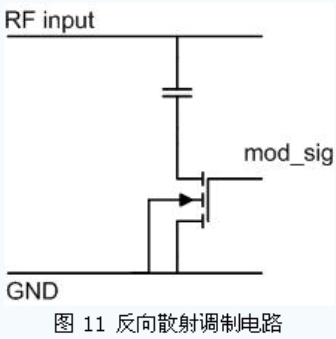無(wú)源UHF RFID 標(biāo)簽一般采用反向散射的調(diào)制方法,即通過(guò)改變芯片輸入阻抗來(lái)改變芯片與天線(xiàn)間的反射系數(shù),從而達(dá)到調(diào)制的目的。一般設(shè)計(jì)天線(xiàn)阻抗與芯片輸入阻抗使其在未調(diào)制時(shí)接近功率匹配,而在調(diào)制時(shí),使其反射系數(shù)增加。常用的反向散射方法是在天線(xiàn)的兩個(gè)輸入端間并聯(lián)一個(gè)接有開(kāi)關(guān)的電容,如圖11 所示,調(diào)制信號(hào)通過(guò)控制開(kāi)關(guān)的開(kāi)啟,決定了電容是否接入芯片輸入端,從而改變了芯片的輸入阻抗。