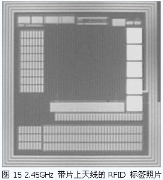 本文所介紹的一些RFID 標(biāo)簽的主要電路,大部分已經(jīng)經(jīng)過(guò)了流片的驗(yàn)證。圖14 是我們所設(shè)計(jì)的一款RFID 標(biāo)簽芯片。芯片面積0.7mm×1.0mm,在36dBm EIRP 下,可在6 米處讀出標(biāo)簽卡號(hào)。圖15 是2.45GHz 帶有片上天線(xiàn)設(shè)計(jì)的RFID 標(biāo)簽。在42dBm EIRP 下,該芯片可在40cm處產(chǎn)生響應(yīng)。