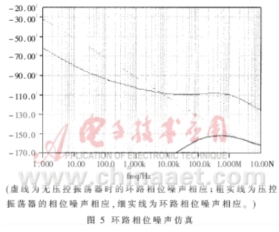 可見分頻式鎖相環(huán)路對于輸入信號、分頻器、檢相器的附加相位噪聲呈低通特性,對于壓控振蕩器的相位噪聲呈高通特性。環(huán)路相位噪聲仿真結果與該結論相符,見圖5。與普通倍頻器件相似,“低通型”的噪聲通過分頻鎖相環(huán)會增加N2倍,輸入?yún)⒖夹盘杹碜苑€(wěn)定信源,其信噪比較高,而分頻器輸出端很小的近旁頻信號在經過