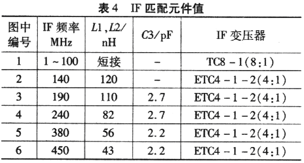 該匹配網(wǎng)絡(luò)對(duì)40MHz以上(包括40MHz)的IF最為合適。對(duì)于40 MHz以下的IF頻率,若串聯(lián)電感器(Ll、L2)的電感值取得過高,用這樣的電感和寄生效應(yīng)將影響穩(wěn)定性,因此,8:1變壓器適合于低IF頻率。適用于 IF頻率的低通濾波的匹配元件值如表4所示。高Q值線繞片式電感器(Ll、L2)大大改善了混頻器的轉(zhuǎn)換增益,但對(duì)線性度還是有點(diǎn)影響。