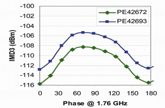 手機(jī)中增加的頻段越多,對(duì)開關(guān)的技術(shù)要求就越高,而且WCDMA的線性度和諧波要求對(duì)器件性能也帶來(lái)了很大的壓力。通過(guò)利用UltraCMOS制造工藝的線性優(yōu)勢(shì),圖2中的單片PE42693 SP6T可以保持其前代SP7T開關(guān)+68dBm的IP3,而且IMD3性能超過(guò)業(yè)界標(biāo)準(zhǔn)的-105dBm(圖1)。