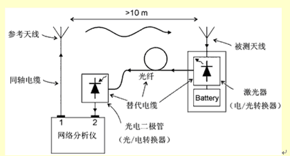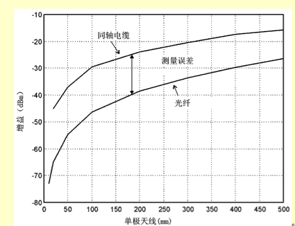 一般地講,我們不知道發(fā)射元件的效率和放大器的增益分別是多大(至少不能通過測量得到,但可以通過模擬或者模型分析得到這些數(shù)據(jù))。相反,G/T損失是直接通過測量天線的輸出噪聲總功率得到的,這時天線是放在一個特殊的環(huán)境中(例如在消聲室中,Ta=T0),增益是用增益置換法借助一個增益已知的參照天線通過測量得到的。但是要小心。要通過標定把測量設備產(chǎn)生的噪聲去掉,在測量時沒有金屬物體(同軸電纜線或者電源線)和它相連。由于這個原因,萊爾德科技公司研制了一種代替電纜線的系統(tǒng),它利用了光纖的原理,連同一個用電池供電的前置放大器,這些在一起可以妥善地測定小天線的電氣特性(見圖1)。估計同軸電纜線引入的測量誤差的設置如圖2所示。圖2中,在單極天線從基板上伸出來的長度不同的情況下,用同軸電纜線和光纖系統(tǒng)測量了它們的增益??梢钥吹?,在長度為10mm左右(這是內(nèi)置天線的實際長度)時,測量誤差超過20dB。