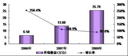 圖1 2006-2008年中國車載公交移動電視終端發(fā)展及增長率