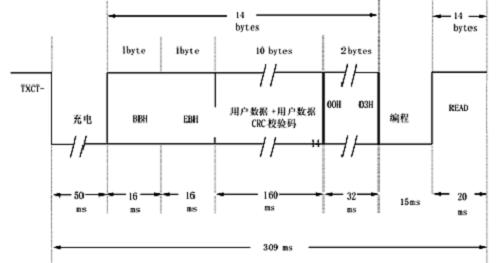 根據(jù)射頻信號的寫入格式,按照如下的寫入時序,即可將數(shù)據(jù)寫入射頻卡內(nèi)。見圖7.