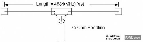偶極型天線如圖呈T型,T型的水平部分長(zhǎng)度為波長(zhǎng)的1/2,波長(zhǎng)若12.5cm,則T型水平部分長(zhǎng)度應(yīng)為6.25cm。