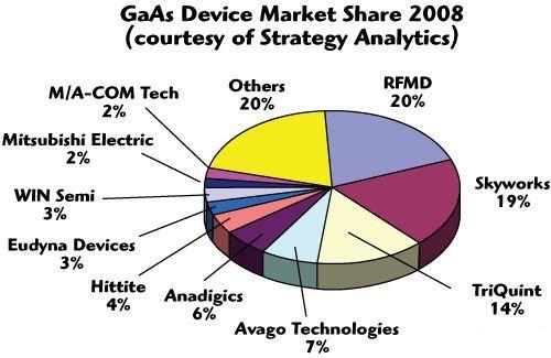 經過多年的發(fā)展,GaAs供應商已經形成了穩(wěn)定的市場格局,由于GaAs產品與工藝關系非常大,大部分廠商都有自己的工廠。下圖是經濟危機開始時2008年GaAs市場占有率情況。