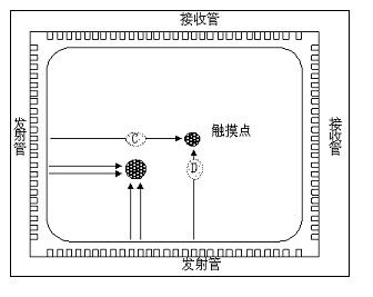 當(dāng)有觸摸時(shí),手指或其它物就會(huì)擋住經(jīng)過(guò)該位置的橫豎紅外線,觸摸屏掃描時(shí)發(fā)現(xiàn)并確信有一條紅外線受阻后,紅燈亮,表示有紅外線受阻,可能有觸摸,同時(shí)立刻換到另一坐標(biāo)再掃描,如果再發(fā)現(xiàn)另外一軸也有一條紅外線受阻,黃燈亮,表示發(fā)現(xiàn)觸摸,并將兩個(gè)發(fā)現(xiàn)阻隔的紅外對(duì)管位置報(bào)告給主機(jī),經(jīng)過(guò)計(jì)算判斷出觸摸點(diǎn)在屏幕的位置。