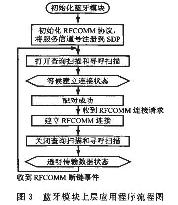 本系統(tǒng)是基于藍(lán)牙的串口應(yīng)用模型SPP(SerialPortProfile)實(shí)現(xiàn)無線數(shù)據(jù)的透明傳輸,在核心協(xié)議棧之上編寫自己的上層應(yīng)用程序。CSR的藍(lán)牙核心協(xié)議棧包括HCI、LZCAP、SDP、RFCOMM等,以固件的形式提供給開發(fā)人員,用戶編寫的應(yīng)用程序和協(xié)議棧一起運(yùn)行在CSR嵌人式環(huán)境中。在CSR程序中,不同任務(wù)之間可以異步地發(fā)送消息,每一個(gè)任務(wù)在創(chuàng)建的時(shí)候可以讓其中一個(gè)擁有消息隊(duì)列,其它的就把發(fā)給任務(wù)的消息提交給該消息隊(duì)列,由任務(wù)調(diào)度程序自動(dòng)運(yùn)行獲得任務(wù)的消息。藍(lán)牙模塊上層應(yīng)用程序流程如圖3所示。