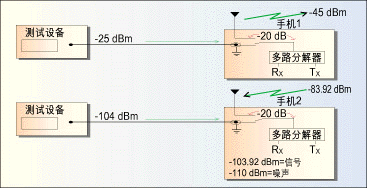 多數(shù)情況下,手機(jī)會(huì)因屏蔽很差的RF電纜或未連接的天線(xiàn)端口很容易受到噪聲影響。一般來(lái)講天線(xiàn)端口是噪聲的主要來(lái)源,特別是如果天線(xiàn)是在測(cè)試時(shí)才接上。圖3表示正在進(jìn)行靈敏度試驗(yàn)的手機(jī)對(duì)另一個(gè)正向鏈路功率-25dBm手機(jī)可能產(chǎn)生的影響情況,手機(jī)1是正在進(jìn)行測(cè)試的手機(jī),具有較高的-25dBm正向鏈路功率。由于手機(jī)1發(fā)射信道功率為-25dBm,假設(shè)未連接開(kāi)關(guān)的衰減是20dB,那么通過(guò)天線(xiàn)未連接端口泄露出的信號(hào)可能高達(dá)-45dBm。
