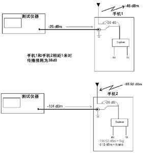 假設(shè)在最壞情況下,手機(jī)1距離手機(jī)2 1米遠(yuǎn)(假定只有遠(yuǎn)場(chǎng)效應(yīng),近場(chǎng)因素很難考慮),將兩個(gè)手機(jī)平行對(duì)準(zhǔn)且手機(jī)之間沒(méi)有衰減材料,則手機(jī)2的天線(xiàn)會(huì)收到一個(gè)高達(dá)-83.92dBm的信號(hào)。這樣手機(jī)2的接收器就會(huì)有-103.92dBm干擾信號(hào),因?yàn)榧僭O(shè)天線(xiàn)到過(guò)電開(kāi)關(guān)的衰減為20dB。這個(gè)例子說(shuō)明了一個(gè)手機(jī)在另一手機(jī)接收信道上產(chǎn)生噪聲的一般原因,根據(jù)例中所做假設(shè),在實(shí)際執(zhí)行中還有很多情況會(huì)引起不同的結(jié)果,這也為認(rèn)識(shí)哪種噪聲會(huì)從一個(gè)手機(jī)進(jìn)入另一個(gè)手機(jī)信道提供了基礎(chǔ)。方位、距離、開(kāi)關(guān)衰減、屏蔽、天線(xiàn)設(shè)計(jì)和實(shí)現(xiàn)方式等,這些因素都會(huì)在引入噪聲的整個(gè)轉(zhuǎn)換中發(fā)揮作用。