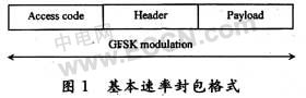 藍牙v1.2基帶數(shù)據(jù)封包中包含了存取碼、標(biāo)頭、保護時段(guard band)和負載(payload),如圖1所示?;舅俾收{(diào)變指的是GFSK,數(shù)據(jù)會以每個符號攜帶一個位元的方式,在1 Mb/s的資料速率下進行傳輸,因此符號速率為1 Ms/s。資料會利用最小115 kHz的載波頻率中的位移或偏差,在RF載波上調(diào)變。高斯脈沖波形將-20 dB的頻寬維持1 MHz,頻譜利用率比BFSK高一倍。