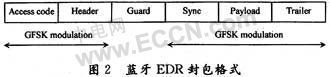 藍牙v2.0 EDR封包先在存取碼和標(biāo)頭的部分使用GFSK調(diào)變模式,但是,在保護時間5μs之后,負載部分則用π/4-DQPSK或8DPSK調(diào)變模式,如圖2所示。在保持指定的1 Ms/s符號速率前提下,增強速率分別提升資料速率到2 Mb/s或3 Mb/s,即每個符號發(fā)射二到三位碼元。通過測試發(fā)現(xiàn)結(jié)果,在封包的GFSK調(diào)變部分振幅顯得相當(dāng)固定,但在DPSK調(diào)變波形中振幅卻有較大的波動。