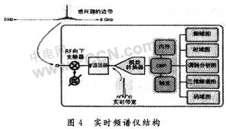 隨著數(shù)字射頻技術(shù)的發(fā)展,要求必須能捕獲并存儲一段時間的信號,并可反復(fù)回放,分析信號隨時間的變化。另外,隨著頻譜利用率不斷提高,干擾將來自更臨近的頻點,甚至同一頻率,這要求頻譜測試技術(shù)在發(fā)現(xiàn)和捕獲能力上實現(xiàn)本質(zhì)性的突破。實時頻譜儀的核心是基于快速傅里葉(FFT)的儀表,可以實時捕獲各種瞬態(tài)信號,同時在時域、頻域及調(diào)制域?qū)π盘栠M行全面分析,滿足現(xiàn)代數(shù)字射頻信號測試的需求,圖4所示為簡化的實時頻譜儀結(jié)構(gòu)圖。