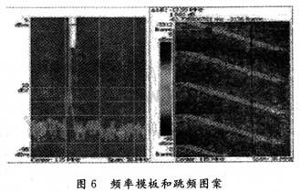 在跳頻情況下,跳頻圖案是否按照設(shè)計的跳頻圖案進行偽隨機跳變,將直接影響到跳頻系統(tǒng)的抗干擾性能和整個設(shè)計是否成功,所以需要對跳頻圖案進行測試驗證。實時頻譜儀的三維頻譜圖(時間、頻率和幅度)是觀測跳頻圖案的一種非常有效的方式,如圖6所示。由于頻率模板觸圖發(fā)功能的使用,可以使得工程師直接設(shè)定跳頻的起始點來捕獲跳頻信號觀測跳頻圖案,這樣就可以找到特定頻率位置的跳頻圖案。而對于傳統(tǒng)儀器只能隨機捕獲,很可能無法捕獲到關(guān)心的跳頻點位置的跳頻圖案。