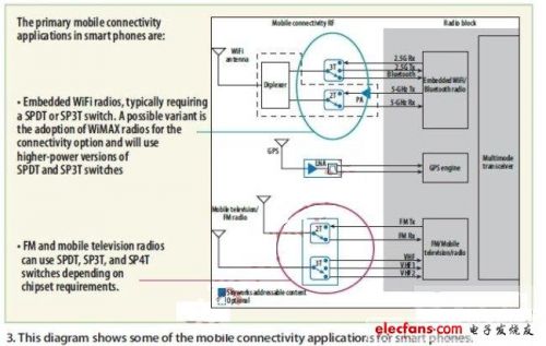 移動(dòng)無(wú)線連接選件一般有兩種實(shí)現(xiàn)方式:使用分立元件和芯片組進(jìn)行設(shè)計(jì),或通過(guò)第三方模塊制造商提供。不管實(shí)現(xiàn)細(xì)節(jié)如何,在智能手機(jī)的移動(dòng)連接側(cè)存在射頻開(kāi)關(guān)的多種應(yīng)用。