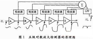 射頻信號檢測的實(shí)質(zhì)是如何實(shí)現(xiàn)將功率信號無失真地轉(zhuǎn)換成電壓信號,而這個(gè)轉(zhuǎn)換工作則由對數(shù)放大檢測器來完成,因此,對數(shù)放大檢測器是射頻測量的關(guān)鍵。它的核心是對數(shù)放大器,對數(shù)放大器之間采用直接耦合方式,分成N級,每級由對數(shù)放大器和檢波器組成。每級的輸出送到求和器,由求和輸出經(jīng)低通濾波器后得到一個(gè)電壓信號。N一般取值為5~9級,級數(shù)越多,單級增益越小,則輸出特性曲線越趨向于線性,這里以5級為例進(jìn)行分析,具體電路如圖1所示。