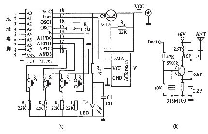 該部分電路主要由315MHz無線數(shù)據(jù)發(fā)射模塊和編碼集成PT2262組成。該無線發(fā)射模塊原理圖如圖1中(b)所示,它具有較寬的工作電壓范圍3-12V,當(dāng)電壓變化時發(fā)射頻率基本不變,和發(fā)射模塊配套的接收模塊無需任何調(diào)整就能穩(wěn)定地接收。當(dāng)發(fā)射電壓為3V時,空曠地傳輸距離約20-50m,發(fā)射功率較小;當(dāng)電壓5V時約100-200m)當(dāng)電壓9V時約300-500m;當(dāng)發(fā)射電壓為12V時,為最佳工作電壓,具有較好的發(fā)射效果,發(fā)射電流約60毫安,空曠地傳輸距離700-800m,發(fā)射功率約500mW.當(dāng)電壓大于12V時功耗增大,有效發(fā)射功率不再明顯提高。發(fā)射模塊采用ASK方式調(diào)制,以降低功耗。當(dāng)數(shù)據(jù)信號停止時發(fā)射電流降為零,數(shù)據(jù)信號與DF發(fā)射模塊輸入端可以用電阻或者直接連接而不能用電容耦合,否則DF發(fā)射模塊將不能正常工作。數(shù)據(jù)電平應(yīng)接近DF數(shù)據(jù)模塊的實際工作電壓,以獲得較高的調(diào)制效果。