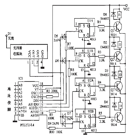 所以輸出接口在未解碼時就為低電平輸出了,即為非鏤狀態(tài)。所以如果將蠶2(a)中酶PT2272--M4改為Pr2272~L4,相應(yīng)的將原理網(wǎng)圖2(a)改為圖3,也能實現(xiàn)同樣的功能,即四路非鎖狀態(tài)。如果將某一路改為蠢錟狀態(tài),將耀應(yīng)的二極管去掉幫霹。鍘如,去掉D5,就將PT2272--L4的第13腳的非自鎖定輸出改為錟定輸出。