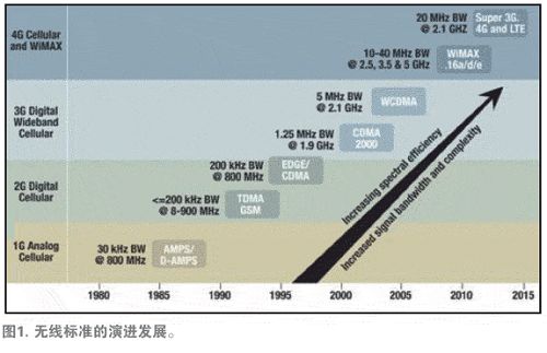 為了解決這一問題,無線提供商轉而采用了可提高頻譜效率的無線標準。這類似于將多輛駛往同一目的地的轎車碼放在一輛卡車上,并將卡車沿著高速公路開往目的地。這種方法使相同的高速公路上可以實現(xiàn)更多的數(shù)據(jù)傳輸流量,而不會導致流量降低。為了提高頻譜效率,我們可部署或定義所有的無線標準,其中包括CDMA2000、W-CDMA、TD-SCDMA、MC-GSM、WiMAX以及LTE等。圖1顯示了近年來用于提高頻譜效率所部署或定義的無線標準。