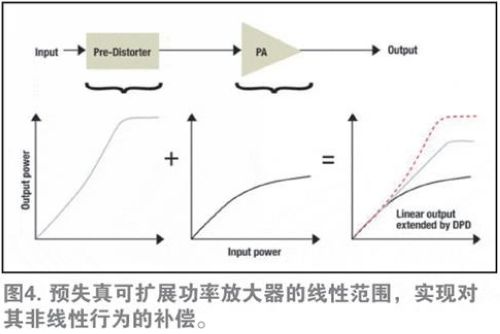 自適應DPD可以擴展寬頻帶射頻(RF)PA的直線性能(straight-line performance),而且遠遠超過正常擴展范圍。如前所述,當輸出功率增加時,輸出功率與理想線性性能曲線發(fā)生偏離。這正是PA放大輸出信號出現(xiàn)失真的地方,從而導致信號質量下降及干擾。DPD可將PA失真輸出信號與非失真輸入信號進行比較。然后,將輸出信號中一個與失真正好對立的信號添加至輸入,從而有效消除失真。由于DPD可擴展PA的線性范圍,因此將其稱為線性化技術(如圖4)。