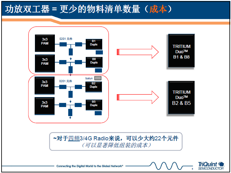 TriQuint中國區(qū)經(jīng)理熊挺介紹,一個更小、更靈活的解決方案可幫助工程師將更高質(zhì)量的產(chǎn)品以前所未有的更快速度推向市場。兩個TRITIUM DUO™模塊構(gòu)成的一個四頻解決方案尺寸僅為50平方毫米,是同等分立方案尺寸的一半,為3G/4G手機(jī)留下更多保貴的空間給其它應(yīng)用,比如增加更多功能或?qū)㈦姵刈龅酶?。并且,高度集成方案也簡化了設(shè)計。這款產(chǎn)品還將節(jié)省設(shè)計時間和資源。該產(chǎn)品具備的靈活性意味著生產(chǎn)速度會更快,需要的連接會更少,最終產(chǎn)生更高質(zhì)量的器件。