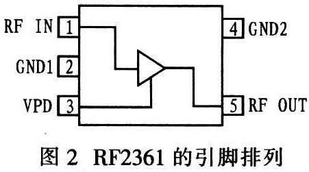 圖2為RF2361的引腳排列,其中:RF IN為低噪聲功率放大器輸入,需通過一阻抗匹配網(wǎng)絡(luò)達(dá)到50Ω阻抗匹配:RF0UT為低噪聲功率放大器輸出,也需通過一阻抗匹配網(wǎng)絡(luò)達(dá)到50Ω阻抗匹配;同時電源VCC給整個電路提供工作電壓。VPD用于控制偏置電流,與偏置電阻R1共同確定偏置電流。GND1、GND2為接地。