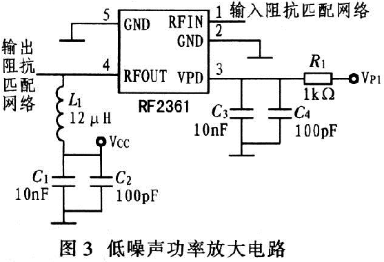 以低噪聲功率放大器RF2361為核心設(shè)計(jì)的低噪聲功率放大電路,如圖3所示,其VPD引腳上的并聯(lián)電容器實(shí)現(xiàn)電源VPD的濾波,RFOUT引腳上的電感電容串并聯(lián)網(wǎng)絡(luò)可對電源VCC濾波?! ?/p>