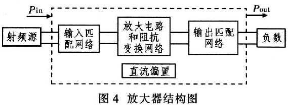典型的放大器一般包括輸入匹配網(wǎng)絡(luò)、晶體管放大電路、阻抗變換網(wǎng)絡(luò)、直流偏置和輸出阻抗匹配網(wǎng)絡(luò),如圖4所示。確定阻抗匹配網(wǎng)絡(luò)中元件的參數(shù)、類型以及連接關(guān)系是實(shí)現(xiàn)匹配網(wǎng)絡(luò)的關(guān)鍵。阻抗匹配是射頻電路設(shè)計(jì)的重要問題,其目的是為了實(shí)現(xiàn)能量的最大功率傳輸,提高能量的傳輸效率?! ?/p>