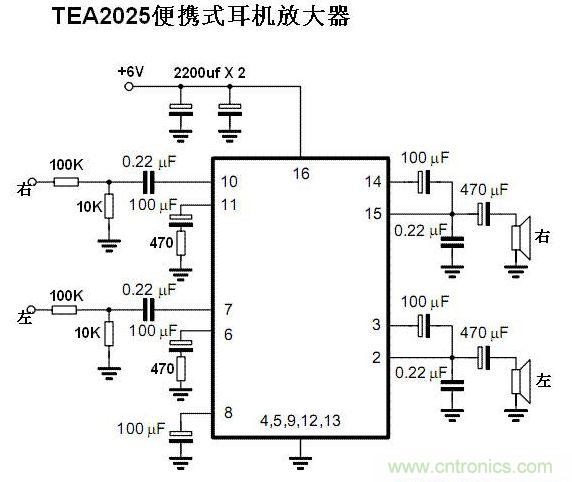 3,TEA2025使用手冊(cè)上推薦的線(xiàn)路,是作為小型功率放大器的應(yīng)用,電壓增益高達(dá)52分貝,不適合直接做耳放。我在它的第6,第11腳對(duì)地串入了470歐姆的電阻以降低增益。