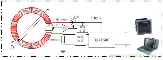 閉環(huán)式霍爾電流變送器是在直測(cè)式霍爾電流傳感器的基礎(chǔ)上發(fā)展起來的,主要由原邊電路、聚磁環(huán)、霍爾器件、次級(jí)線圈和放大電路、采樣電路、調(diào)零電路以及隔離變送模塊組成,如圖1。主回路電流IP 在聚磁環(huán)所產(chǎn)生的磁場(chǎng),通過一個(gè)次級(jí)線圈的電流產(chǎn)生的磁場(chǎng)進(jìn)行補(bǔ)償,使霍爾器件始終處于檢測(cè)零磁通的工作狀態(tài)。流經(jīng)次級(jí)線圈的電流Is經(jīng)過精密電阻RL進(jìn)行采樣,為了減小恒流源的負(fù)載能力,此精密電阻RL的阻值較小。精密電阻將電流信號(hào)變換成mV的電壓信號(hào),此信號(hào)經(jīng)過濾波器的濾波作用后直接接入金升陽TM系列信號(hào)調(diào)理模塊進(jìn)行信號(hào)隔離放大變換,變換換成工業(yè)需要的標(biāo)準(zhǔn)信號(hào),如4-20mA、0-20mA、 l-5V、0-5V等標(biāo)準(zhǔn)直流信號(hào),供給智能儀表顯示或者直接供給現(xiàn)場(chǎng)PLC或DCS系統(tǒng)使用。如果原邊電流Ip發(fā)生變化,則Ip產(chǎn)生的磁通發(fā)生變化,則在霍爾元件的兩表面產(chǎn)生電勢(shì)差,此電勢(shì)差經(jīng)過運(yùn)放的放大作用,直接控制Is補(bǔ)償電流的大小,此補(bǔ)償電流恰好與被測(cè)電流的方向相反,從而補(bǔ)償了原來的磁場(chǎng),使得霍爾器件處于零磁通的狀態(tài)中。所以Is的電流可以真實(shí)地反映出原邊Ip的電流的變化,反應(yīng)速度快。