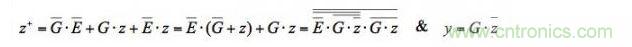 從這個(gè)公式可以看出,其中針對(duì)z+的最小項(xiàng)[E●z]不是多余的。它在最小項(xiàng)[G●E]和[G●z]之間扮演著反競(jìng)爭(zhēng)橋的重要角色,可以消除G的所有邊沿處的連續(xù)競(jìng)爭(zhēng)。