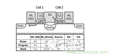 1 第3代SuperFlash存儲(chǔ)單元的結(jié)構(gòu)和典型工作條件。圖中給出了兩個(gè)共用源極和擦除柵極的單元。圖中用箭頭指示燒寫(xiě)(單元1)和擦除(單元2)期間的電子轉(zhuǎn)移情況。WL為字線(選擇柵極),CG為耦合柵極,EG為擦除柵極,F(xiàn)G為浮置柵極。