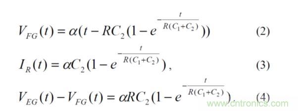 圖5顯示了SuperFlash單元的簡(jiǎn)化R-C圖及其等效電路。其中,C1為EG-FG電容,C2為總FG電容與CFG-EG的差值,R為有效隧穿電阻。VEG線性斜坡(VEG=αt)和歐姆電阻R組成的等效電路中的瞬變具有簡(jiǎn)單的閉環(huán)解決方案: