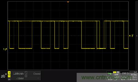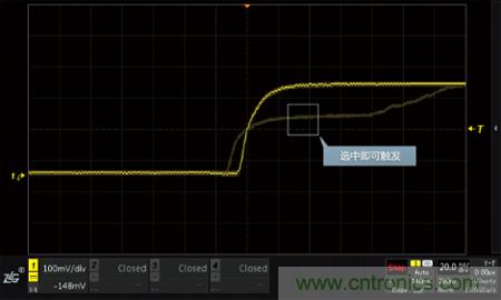 如下圖所示,設(shè)置了欠幅觸發(fā)及普通觸發(fā)后,欠幅脈沖信號被觸發(fā),穩(wěn)定的顯示在屏幕上。