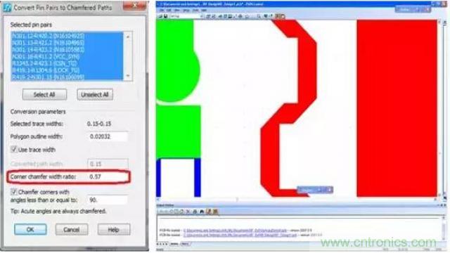 射頻和微波電路中經(jīng)常用到倒角,以減小饋線與電容器之間的分段不連續(xù)性電抗,從而改善MMIC 的頻率性能。90º 拐角與倒角之間的距離至關(guān)重要。因此,設(shè)計人員需要采用自動方法來基于設(shè)計指定需要生成的倒角比率。PCB 設(shè)計工具如果能夠基于設(shè)計規(guī)則自動強制實施需要生成的倒角比率,設(shè)計人員和工程師將會從中受益,在節(jié)省時間的同時提高設(shè)計質(zhì)量(圖3)。
