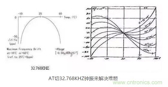 AT切晶體頻率溫度曲線為三次曲線,呈躺著的"S"型曲線,隨著溫度的變化,溫漂呈"S"型軌跡變化,大致在-10℃和+60℃時,有兩個"拐點",即溫漂又會反方向拐回來。因此,只要控制好晶片的切角在一定的公差范圍內,那么保證兩個拐點溫漂在-40℃~85℃時不超過±30ppm并不是一件難事。然而,AT切晶體只針對MHZ頻率的晶體,如何轉換成32.768KHZ頻率?鐘振32.768KHZ通過分頻方式,便可以實現(xiàn)。如采用AT切16.777216MHZ晶體,通過512分頻,那么就可以得到想要的32.768KHZ頻率。鐘振實現(xiàn)對頻率的分頻并不困難,都集成在振蕩IC內部。因此,使用AT切MHZ 分頻實現(xiàn)的32.768KHZ鐘振,在頻率溫度特性上,有很大的改良,在沒有進行溫度補償?shù)臅r候,-40℃~85℃條件下,溫度頻差保持在±30ppm甚至±20ppm都是可以實現(xiàn)的。